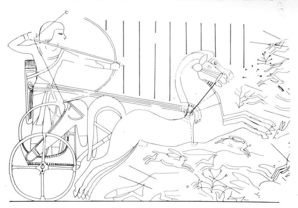 Der andere Szenentypus betrifft die Jagd zu Wagen (siehe Abbildung 2 und Abbildung 3). Auch hier gibt eine Beischrift Aufschluss über die Gemütslage des Besitzers (Aus ): „Durchziehen des Tales und Durchstreifen der Berge. Vergnügung findend beim Schießen des Wüstenwildes seitens des Königsschreibers, gelobt vom „Guten Gott“ (=Pharao). Der ihm (=Pharao) auf seinen Zügen folgt in das südliche und nördliche Fremdland“10.